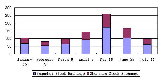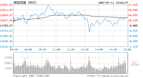 Stock up 1.3%, despite capital diversion to new shares, 07/12Updated: 2007-07-12 16:16 Chinese stock trading went smoothly today and prices ended up 1.3 percent. The Shanghai Composite Index finished at 3,915.99, up 50.27 points. Total turnover of stocks on the major indices was 102 billion yuan, higher than the 99 billion yuan of yesterday, or the smallest in four months. Dates with monthly lowest turnover in 2007 (billion yuan) Opening higher at 3,874.04, the benchmark index climbed to a high of 3,925.60 gradually with few deviations from an upward trend early in the day. Then it turned around and slid to a low of 3,861.04, before rising to its closing point. Shanghai Composite Index ![]() Of the A shares listed in Shanghai, 483 went up, while 300 dropped and 57 ended flat. New share West Mining rose 144 percent to 19.36 yuan as the top gainer, followed by Shanghai Port Container and Shandong Jiufa Edible Fungus, also sealed at the maximum growth cap of 10 percent. Sanlian Commerce, however, lost 34 percent, the day's biggest loser. Following West Mining, China Minsheng Banking Corp ranked second both in terms of trading volume and transaction value, and saw its share price rise 2.5 percent to 12.22 yuan. The Shenzhen Component Index, tracking the smaller Shenzhen Stock Exchange, opened higher at 12,811.15 and closed at 12,850.74, up 65.07 points or 0.51 percent. Its priced remained within a range of 12,729.05 to 12,951.72. Shenzhen Component Index ![]() Of the index's A shares, 325 were up, 212 down and 78 unchanged. East China Engineering Science and Technology ranked on top of the surging share prices with a 147 percent rise on its first trading day while Anhui Gujing Distillery, suspected of price manipulating conducts, lost 10 percent to lead the fall. China Vanke, with both the largest trading volume and transaction value, added 0.06 yuan to its share price. Stocks in the timber, retail, wholesale and services industries performed best today. Fujian Yongan Forestry Group surged 5.5 percent to pioneer the forestry sector. B shares were particularly strong today. Of the 109 listed B shares, only four dropped and two ended flat. Chengde Dixian Textile climbed 10 percent to 2.81 yuan, as today's biggest B-share gainer. |