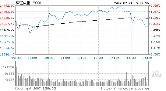 Updated: 2007-07-24 17:31 Led by outstanding performances of steel and real estate stocks, today's Chinese shares tried to extend yesterday's gains and approached the all-time high. But most efforts were eliminated in the last trading hour by huge profit-taking funds, which pushed the benchmark index back into a deficit close. Opening 25 points higher than yesterday's close, the Shanghai Composite Index hovered around 4220 points in the morning session, and marched towards the day's highest of 4284.83 around 2 PM, only 50 points below its all-time high. However, before investors could celebrate the feat and expect more, the index staged a surprising diving show and lost all the gains of the day within the last trading hour. The 4200-point stronghold was lost for a while before the index rebounded a bit and closed at 4210.33, 3.03 points lower than yesterday's close.