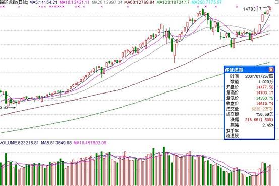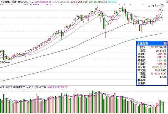 Updated: 2007-07-26 17:51 Major stock indices in the bourses of Shanghai and Shenzhen both topped their all-time highs on Thursday and consolidated gains amid rosy corporate earning prospect reports and continuing reminbi appreciation. Continuing Wednesday's enthusiasm, the key Shanghai Composite Index broke the May 29 record of 4335.96 quickly with an exciting opening of 4347.78, 23 points higher than last day's close. In spite of a series of fluctuations due to investors' apprehensiveness and profit-taking funds, the index managed to close at historical 4346.46 high, with a slight increase of 0.52 percent. The Shenzhen Component Index, however, did not break its record high by only a narrow margin in the morning session, saving strength for an afternoon charge. The index reached its peak of 14703 around 2 PM and ended at 14619.74, the highest close ever. Shanghai Composite index