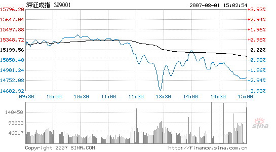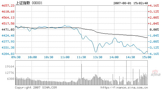 Updated: 2007-08-01 17:34 Major Chinese stock indices suffered their greatest loss in four weeks on Wednesday, a result of a sizeable sell-off and internal corrections, after surging nearly 1000 points in the last month. The benchmark Shanghai Composite Index continued its booming trend in the morning with a record-high open of 4488.77 points, but failed to hold on under huge selling pressure. After briefly touching the 4500 point level midmorning, the index began a steep dive that continued through remaining trading hours. It plunged downward to 4300 points and reached the day’s lowest of 4284.87 points before close. Although bargain hunters pushed the index up a little to 4300.56 in the end, the index still lost 170 points or 3.81 percent within the day, the largest since July 5. Trading value of the market climbed to 173.2 billion yuan, some of which is attributed to panic selling in the afternoon.