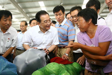 Premier Wen Jiabao reassured the public on Saturday that the government will ensure supply and stabilize prices as the nation has achieved steady and fast economic growth for several years with good harvests of grain crops and rapid industrial growth. Wen was addressing public concerns over price hikes after the country's consumer price index hit a 33-month-high of 4.4 percent in June. Several industries including catering and oil have started to raise prices, which have triggered complaints from the public. To get firsthand information about the situation, Wen visited the Xinfadi farm produce wholesale market, the largest of its kind in Beijing, on Saturday morning. Pork vender Qian Guangping complained to Wen that rising prices had dented demand and cut his sales from 600 kg per day to 500 kg. "I earn much less now. When do you think the price will fall?" he asked. "As pig breeding has a production cycle, it will take some time," Wen said, assuring him that the government has introduced a package of policies. Guo Shuping, who was shopping for pork, said to Wen: "The price is a bit high. Lean pork costs 11.5 yuan per jin (half a kilogram). Even the butt costs 9.8 yuan." At 10 am, Wen went to the Wanfa Hengshun farm produce market in Xicheng district, which helps supply food to more than 40,000 people in the Sanlihe area. As Wen spoke to Wu Guifang, he took an egg from her shopping bag and asked what she thought of the current prices. Wu said some vegetables had become expensive, but the price hikes were not huge. Wen nodded and urged the market's management to ensure all deals are done in an open, fair and transparent manner. No one is allowed to hoard stocks to drive up prices, he said. He said the current price hikes had been mainly led by farm produce and non-staple foodstuffs such as grain crops and pork. But there were a few market dealers seeking price alliances to rig the market and damage the interests of the public. |