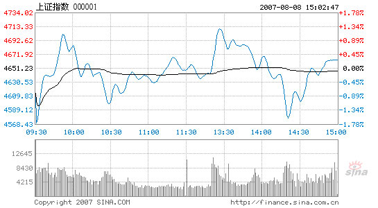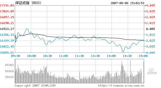 Updated: 2007-08-08 16:45 Chinese stocks continued price adjustments in violent swings with no clear trend for the day. The Shanghai Composite Index managed to close up 12 points, driven by a few large-cap blue chips, but the Shenzhen Component Index dropped nearly 2 percent. Total turnover of the stocks enclosed by the two indices was 242 billion yuan, 32 billion yuan down from yesterday. Shanghai Composite Index Stocks in Shanghai saw higher volatility today, with the spread of movements by the benchmark index extending to 143 points from yesterday's 100 points and Monday's 65 points. The index, opening lower from 4,614.59, dived deep to its lowest of 4,568.7 immediately after the opening, then bounced back before it started fluctuating violently. In the afternoon session, it toughed out a higher 4,711.32 but failed to maintain that level. Finally, it finished at 4,663.16, 11.94 points or 0.26 percent higher than yesterday, as a new record-high close. Of the A shares listed on the Shanghai bourse, 229 closed up while 545 slipped and 68 finished unchanged. Long Jian Road and Bridge led a total of five stocks to rise at least 10 percent, the maximum movement cap for stocks on a single-day trading. Shanghai Kaikai Industry, however, was down 9.98 percent to finish the day on the bottom. The Industrial and Commercial Bank of China, the largest trader both in terms of trading volume and transaction value, had an astonishing 9.83 percent surge, a rise seldom seen on the heaviest-weighted blue chip stock, and saved the index from slumping as its Shenzhen counterpart did today. Shenzhen Component Index The Shenzhen Component Index, tracking the smaller Shenzhen Stock Exchange, was down 329.55 points or 1.99 percent to 16,193.72. Opening lower from 16,346.53, it went through the day in a range from 15,864.63 to 16,532.77. Of the A shares, 152 went up, 401 slipped, and 69 closed flat. New share Maanshan Fangyuan Slewing Ring rocketed 479 percent to 47 yuan to top the gainers list. Risesun Real Estate Development, also new to the exchange, saw its share price almost tripled to 50.8 yuan. On the other side, Huangshan Novel led the mainstream fall with a 9.4 percent drop. Stocks in the timber, food, and machinery industries rose the fastest while the rise of heavyweight banking shares such as Bank of China, China Minsheng Banking Corp and China CITIC Bank helped stop the Shanghai index from slipping. Closed-end mutual funds were down, with both the fund indices dropping over 1 percent. B shares were weak, with 36 of them closing up, 8 unchanged and 65 down. Jinzhou Port grew 9.2 percent as the top gainer. |