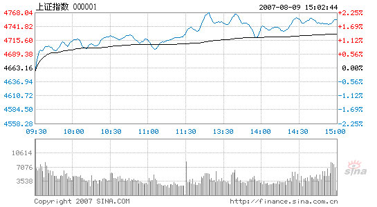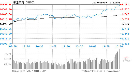 Updated: 2007-08-09 16:34 Chinese stocks shrugged off tightening warnings by the central bank and formed a strong upward trend today, with both major indices closing at record highs. Today, the majority of Chinese stocks resumed strong growth and reversed yesterday's sluggish performance, which was pushed up by a single heavyweight blue chip. The pending July consumer price index (CPI) is estimated to grow a record 5 percent according to investment banks including Goldman Sachs, Credit Suisse, and Shenyin Wanguo Securities. Total turnover of the stocks enclosed by the major indices was 208.5 billion yuan, the lowest this month. Shanghai Composite Index ![]() Unlike yesterday's sluggish performance, saved from a slump by a single heavyweight blue chip, today the benchmark Shanghai Composite Index began marching upward immediately after opening lower from 4,658.59 and left the starting point behind as the lowest of the day. It hit the highest 4,768.89 soon after trading resumed in the afternoon session. After that, and following a few adjustments, the index finally ended at 4,754.10, up 90.93 points or 1.95 percent from yesterday's closing. Of the A shares listed in Shanghai, 447 went up today, while 278 closed down and 77 finished flat. Jiangxi Xinxin Industrial, rising 10.08 percent to 7.1 yuan, topped of the gainer's list, leading another 16 stocks that sealed the 10 percent maximum growth cap and 10 rising nearly 10 percent. Shanghai Kaikai Industrial, however, dropped another 9.99 percent to make the bottom of the list today. The Industrial and Commercial Bank of China, the largest trader both in terms of trading volume and transaction value and the only force that saved the index from losing 50 points yesterday, slowed today as analysts expected. It ended up 0.17 yuan or 2.67 percent by the closing. Shenzhen Component Index ![]() The Shenzhen Component Index, tracking the smaller Shenzhen Stock Exchange, mapped out a similar pattern. It opened higher from 16,194.04 and closed at 16,680.38, 486.65 points or 3.01 percent higher than the previous closing, also a new record-high close. The index went through the day between its opening point and a high of 16,691.87. Of the A shares, 341 went up, 202 closed down, and 79 ended unchanged. China Tungsten and High-Tech Materials grew 10.02 percent as the top gainer while Suzhou Good-Ark Electronics lost 10 percent on the other end of the league. The largest trader China Vanke rocketed 9.51 percent to 35.34 yuan. Stocks in the real estate, paper, and metal industries led the surge. Chongqing Yukaifa gained nearly 10 percent to pioneer the real estate shares on the rise. Wholesale and retail sectors were also strong. Closed-end mutual funds were up, with both indices surging over 1 percent. Of the 109 listed B-shares, 61 closed higher and 11 remained unchanged today. |