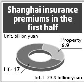 In the first six months of this year, Shanghai's premium income in property insurance increased 17.9 percent year-on-year, to 6.87 billion yuan, and life insurance gained 5.84 percent, to 17.05 billion yuan, over the same period.