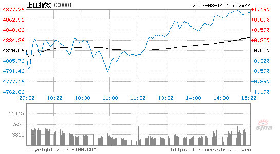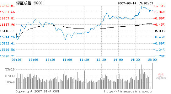 Updated: 2007-08-14 16:15 Chinese stocks continued edging up today amid price adjustments and less heated transaction totals. Total turnover of stocks in the major indices shrank to 191.2 billion yuan, the smallest in three weeks. Shanghai Composite Index ![]() The Shanghai Composite Index finished at 4,872.79, up 52.72 points or 1.09 percent from yesterday's closing. Opening almost flat from 4,820.15, the index went through the morning session in short-ranged fluctuations, hitting a low of 4,789.90 half an hour before the noon break. In the afternoon, however, it grew steadily and closed a little lower than the highest 4,876.85, reached just before the end of trading. Of the A shares listed in Shanghai, 678 went up today while 99 closed down and 65 finished flat, overruling the "20 to 80" theory that has dominated the market on most occasions. Nanjing Textiles Import and Export, rising 10.05 percent to 8.43 yuan, topped the gainers' list to lead another 19 stocks with the maximum 10 percent growth on the first places. Wuhan East Lake High Technology, resuming from a share structure reform, dropped 17 percent on the other end of the table. The Industrial and Commercial Bank of China, resuming its first place position on the largest trading volume list, was down 0.05 yuan. CITIC Securities, with the largest trading volume, surged 8.5 percent to 82.48 yuan. Shenzhen Component Index ![]() The Shenzhen Component Index, tracking the smaller Shenzhen Stock Exchange, opened lower from 16,092.47, but closed 235.78 points or 1.46 percent to 16,351.90. It went through the day within a range of 16,010.20 to 16395.46. Of the A shares, 496 went up, 58 closed down, and 74 ended unchanged. Tianjin Guangyu Development led 12 stocks surging to the maximum growth cap while Huayi Compressor slid 10.04 percent on the bottom of the league. China Vanke, the largest trader, added 0.17 yuan to its share price. |