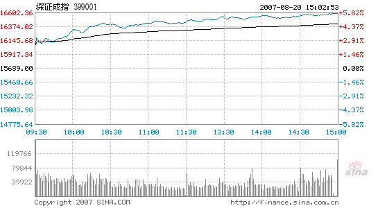 Updated: 2007-08-20 16:29 Chinese stocks rocketed 5.33 percent amid a full-range comeback in Asian stock markets today. The comparative growth rate was the largest single-day surge since May 30. Instead of a few heavyweights lifting the whole market up as in recent cases, today both index-drivers and smaller-cap shares surged in waves, as 1,312 of the total 1,476 A shares surged in waves to higher price levels. Total turnover of the stocks enclosed by the major indices was 219.8 billion yuan, higher than that of last Friday. Shanghai Composite Index ![]() The Shanghai Composite Index opened at 4,773.83, 117 points higher than the previous close and marched steadily all the way to a high of 4,906.00, except at a drawback point of 4,758.40 soon after the opening. Finally, it closed at 4,904.85, up 248.28 points, a new record-high close. Of the A shares listed in Shanghai, as many as 765 went up, while only 14 dropped and 63 finished flat. Guizhou Wire Rope rose 10.04 percent to 10.41 yuan, leading another 22 stocks surging with the maximum growth cap of 10 percent on the top. Shandong Hiking International, a special treatment stock, slumped 4.94 percent on the bottom. The Industrial and Commercial Bank of China, the largest trader both in terms of trading volume and transaction value, surged 9.75 percent to 7.09 yuan, driving the index higher to 4,900-points. Shenzhen Component Index ![]() The Shenzhen Component Index, tracking the smaller Shenzhen Stock Exchange, opened higher at 16,078.84 and closed at the daily high of 16,589.80, up 900.8 points or 5.74 percent. It almost broke the previous record of 16,680.38, from August 8. The index hit its low of 16,078.84 in the morning but afterward seemed unstoppable. Of the A shares, 546 closed up, 15 fell, and 73 finished unchanged. Twenty stocks, led by Shandong Luneng Taishan Cable, with the largest trading volume, ranked on top of the table with the maximum growth rate of 10 percent. Zhejiang Baoxiniao Garment, however, slipped over 5 percent as the biggest loser today. China Vanke, with the largest transaction value, rose 7.2 percent to 33.07 yuan. Stocks in the mining, finance, and real estate industries were the best performers. All the mining and financial shares were up today. Most of the B shares and closed-end mutual shares also enjoyed big gains. |