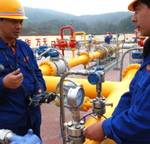 Workers test the pressure of a natural gas pipeline in Hubei Province. China on Friday afternoon launched a gas pipeline running from Sichuan to Shanghai. [newsphoto]