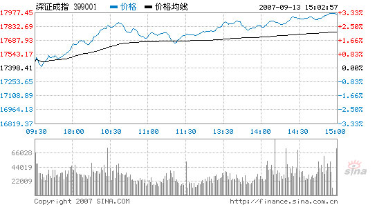 The Shenzhen Component Index, tracking the smaller Shenzhen Stock Exchange, finished at 17,959.52, up 561.11 points or 3.23 percent. Opening higher at 17,469.25, it went through the day above the previous closing level, between 17,406.96 and 17,971.52.