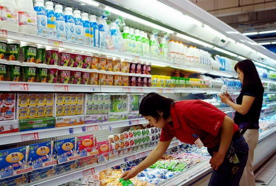 Shoppers select dairy products in a supermarket in Zhengzhou, Henan Province, according to this May 22 file photo. China announced measures Sunday to support the dairy industry as 30 percent milk cow raisers suffered losses in 2006. [newsphoto]