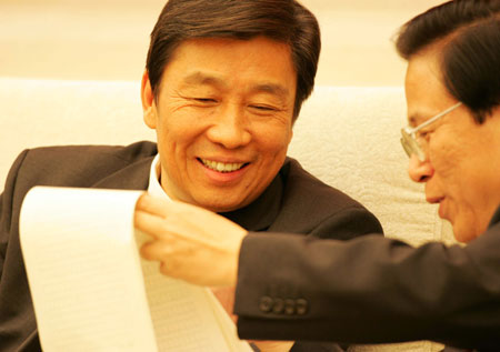 Li Yuanchao (L), Party secretary of Jiangsu Province in east China, chats with another delegate during a panel discussion in Beijing October 15, 2007. [newsphoto]