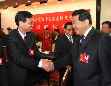 Jia Qinglin (R), member of the CPC Central Committee Politburo Standing Committee, attends a group discussion of the Beijing delegation of the 17th CPC National Congress in Beijing, October 16, 2007. [Xinhua]