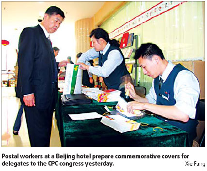 Postman Wu Lei is not sure how many stamps he has put on the commemorative covers issued for the Party congress, but the brace around his right middle finger speaks volumes.