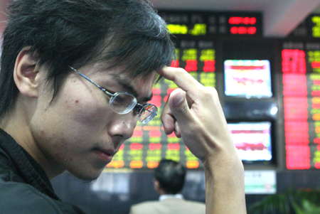 A worried investor at a securities trading house in Fuyang, East China's Anhui Province. The Shanghai Composite Index fell 3.5 percent, or 211 points, to close at 5825.28 yesterday. [China Daily]
