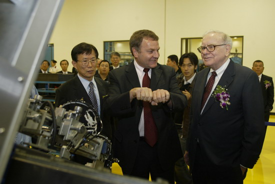 Billionaire Warren Buffett (right) visits a subsidiary of his fund firm in Dalian, Northeast China's Liaoning Province. He cautioned investors against risks as China stocks more than doubled this year. [China Daily]