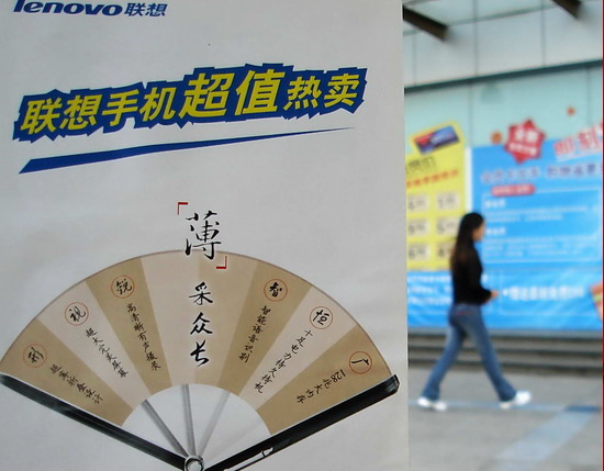 The billboard of Lenovo mobile phone on a Shanghai street. The world's third-biggest PC maker tripled fiscal second-quarter profit after reducing jobs and winning market share. [newsphoto]