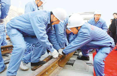 Workers lay the last rail of the Beijing-Tianjin high speed railway in Tianjin, on Sunday, December 16, 2007. The railway, scheduled to begin operation next August, will shorten travel between the two cities to 30 minutes.  [People.com.cn]