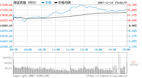 Updated: 2007-12-25 09:53 The Shenzhen Component Index, tracking the smaller Shenzhen Stock Exchange, opened higher at 16,931.04, went through the day within a bound between 16,895.25 and 17,266.58, and finished at 17,153.93, up 345.25 points or 2.05 percent. Of the A shares, 473 rose, 110 ended flat while 92 closed down. From the macroeconomic perspective, there is even more good news for today's market. A draft amendment on personal income tax law lifting the tax-free threshold from the current 1,600 yuan to 2,000 yuan is being studied by the National People's Congress (NPC), and likely to be adopted on Friday and take effect from March 1 next year, legislators said. More depository income for Chinese residents will generate more capital influx and is beneficial to the capital market in the long-term, industrial experts said.