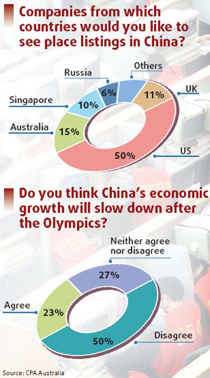 More should be done to attract IPOs from other markets, according to 86 percent of the respondents. Half of those surveyed said they would like to see more US companies listing on the mainland, 15 percent Australian and 11 percent said more UK firms should list here. That response is in line with the strategy of Shanghai Stock Exchange. Que Bo, assistant to general manager of Shanghai Stock Exchange, told Securities Daily in November: "We are considering rolling out more financial tools for blue chips to attract HSBC, Coca-Cola, Siemens and other multinationals in China to list in Shanghai." Some analysts said that's a step in the right direction and would bring income for the domestic bourses, ease excess liquidity pressure and enable multinationals to accelerate expansion plans. "Measures can be taken to attract multinationals - through the legal framework, improved corporate governance, more skilled financial professionals and better local-investor knowledge," said Huang Zhensheng, vice-president of CPA Australia in Beijing. Huang said the corporate governance of listed companies could be improved by instituting an annual compliance statement and independent review. Corporate governance was a top concern for respondents - 87 percent said investors in Chinese companies were not adequately informed of company activities and financial details. Meanwhile, 93 percent called for greater transparency in financial reporting and 99 percent said corporate governance need to improve. "These figures are not too alarming when you consider the maturity of the market in China. The government is making every effort to bring companies in line with financial reporting requirements and corporate governance standards but a lot of the emphasis on implementing these changes is now the responsibility of the business community itself," said Huang.
