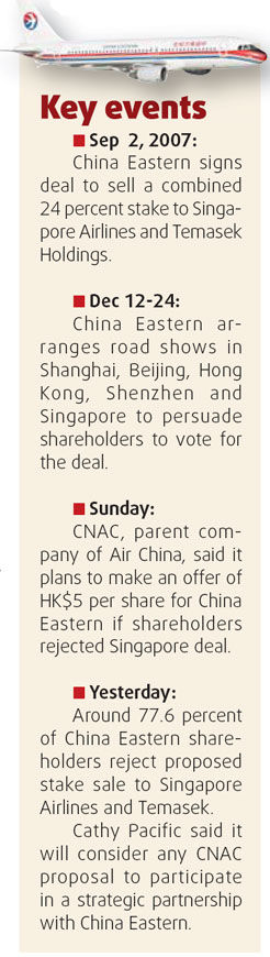In a rare show of shareholder power in Chinese companies - at a three-hour extraordinary general meeting (EGM) yesterday afternoon - 77.6 percent of CEA shareholders rejected the management's attempt to sell a 24 percent stake to SIA and Lentor investment Pte Ltd, a wholly owned subsidiary of Singaporean government investment company Temasek. On September 2 last year, CEA signed an agreement to sell a combined 24 percent stake to SIA and Temasek at HK$3.80 per share. But last Sunday, China National Aviation Corp (CNAC) - the parent company of Air China Ltd - which already owns 12.07 percent of CEA, announced that it was willing to make a higher offer of HK$5 a share. In yet another twist to CEA's equity restructuring saga, its chairman Li Fenghua told a press briefing after the EGM that since CEA and Air China are "at the same level in terms of operation, management and market performance," the company has no reason to consider embracing the latter as a strategic partner "no matter how high a price it can offer". However, CNAC had clearly thrown a wrench into the proposed Singapore deal by making the latter's offer appear less attractive. CEA's Li admitted that the voting result was within his expectations because a vast number of shareholders who had previously supported the deal had changed their mind since the CNAC offer. An EGM attendee, surnamed Ji who claimed to own 600,000 CEA H shares, told China Daily that he thinks SIA's offer price was too low and unfair to minority shareholders. Yang Peng of Rongtong Fund Management Co Ltd, which claims to be the third-largest owner of CEA's circulating shares, said that he also voted down the deal and wanted the company to consider CNAC's higher offer. SIA was quick to express disappointment over the scuppering of its CEA investment plan. But it said it "will continue to support the building of a relationship with China Eastern, noting that the airlines are still mutually willing to develop the relationship". CEA's Li also said the company "will further study the possibilities for the alliance with SIA and also consider shareholders' suggestions". CNAC, meanwhile, promptly announced plans to submit a formal offer to CEA in two weeks following the EGM decision. But CEA's Li stressed that the offer price was not going to be a major obstacle. "If SIA raises its price, CNAC may follow suit by offering an even higher price. But that would not be an effective way to solve the problems facing us," he said. He added that his company would mull over further plans to act against the CNAC bid, although he declined to release further details. Analysts said that yesterday's voting result was not unexpected because of CNAC's higher offer price. Air China will try desperately to gain a leading position in such an important international aviation hub as Shanghai, they pointed out. CEA accounts for 35 percent of the aviation market in Shanghai, followed by Shanghai Airlines (18 percent) and Air China (12 percent). But "Air China's market share is expected to soar to 50 percent if it succeeds in merging with CEA," said Zheng Qingping, an analyst at Tebon Securities. "All major airline companies are striving to expand their market share in Shanghai," he added.