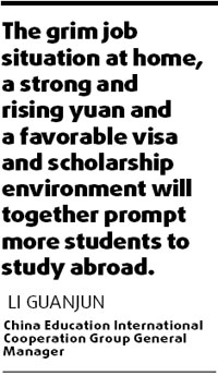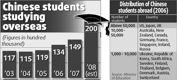 Updated: 2008-01-17 14:47 The number of students going abroad for studies is estimated to reach 200,000 this year. Correspondingly, the number of high school and college graduates is expected to hit a record high of 14.8 million and 5.5 million this year, China Education International Cooperation Group General Manager Li Guanjun said. Last year, China had 14 million and 5 million fresh high school and college graduates, according to the Ministry of Education (MOE). And one-fifth of those college graduates had failed to find a job by the end of last year, the MOE said. "The grim job situation at home, a strong and rising yuan and a favorable visa and scholarship environment will together prompt more students to study abroad," Li said. "So I expect a 30 percent rise in the number of those going abroad for studies." The number of such students has been rising in recent years, with about 150,000 traveling overseas last year. "An average of 130,000 Chinese have been going abroad for studies every year over the past few years, boosting exchanges in the educational fields," said Liu Baoli, deputy director of MOE's international cooperation and exchange division. The US, Britain, Australia and Canada are the top choices of the students eager study abroad. Thanks to the easing of US visa rules last year, realizing the "American dream" is no longer very difficult for many Chinese students, said Liu Xuyan, counsel for Beijing Chivast Education International, a leading agency that helps students to study abroad.