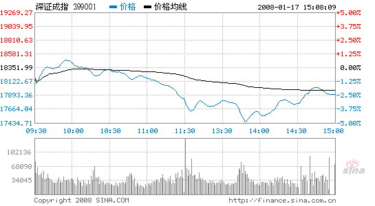 The Shenzhen Component Index, tracking the smaller Shenzhen Stock Exchange, closed at 17,910.39, down 441.61 points or 2.41 percent. Total turnover at the two exchanges was 268 billion yuan, the largest this week. The government has started to temporarily intervene in the market to control the prices of a range of daily necessities such as grain and meat, and rein in inflationary pressure. In an effort to soak up excess liquidity in the market, the PBOC has hiked the reserve requirement ratio 50 basis points to a record high 15 percent - meaning that there will be less cash available when the new law goes into effect on January 25. With continuous price corrections, the Chinese market joined the world's stock price plunges. Fears of a US recession and concerns about widening losses among top global financial institutions, such as Citigroup, from the subprime mortgage crisis, have put Asian stock markets under pressure. The Hong Kong stock exchange dived 5 percent yesterday.