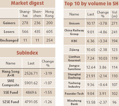 Updated: 2008-03-05 10:16 ![]() ![]() Sharp falls in banking and financial stocks dragged down yesterday's lead indicator by more than 2 percent. The Shanghai Composite Index fell 2.32 percent, or 102.82 points, to close at 4335.45. The smaller Shenzhen Component Index dropped 2.73 percent to end at 15746.23 points. Turnover on the Shanghai bourse totaled 137 billion yuan, up 8.3 percent from the previous trading day, while that on the Shenzhen Stock Exchange reached 66.6 billion yuan. Analysts said investor confidence has remained vulnerable to uncertainties overhanging the market, including further monetary tightening measures to combat inflation and more new share issue plans by publicly listed companies. Banking and financial stocks led yesterday's price drop. All of 15 bank stocks traded fell yesterday, with the Shenzhen Development Bank plummeting 9.85 percent to close at 29.75 yuan and Shanghai Pudong Development Bank sinking 8.99 percent to close at 38.98 yuan. Ten of the 11 securities stocks also saw big falls, with CITIC Securities slumping 4.71 percent to 62.45 yuan and Guoyuan Securities Co in Anhui province sliding 4.53 percent to 28.43 yuan. Mao Nan, an analyst at Orient Securities in Shanghai, said poor performance in other stock markets in Asia has exacerbated investor worries about global economic problems highlighted by the US subprime mortgage crisis and escalating oil and other commodity prices.