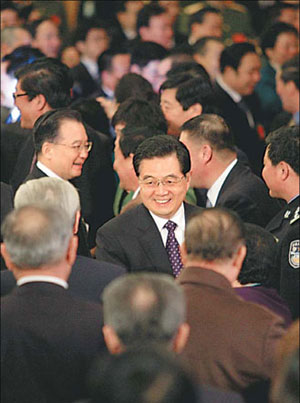 President Hu Jintao and Premier Wen Jiabao greet deputies at a preparatory meeting for the 1st session of the 11th National People's Congress in the Great Hall of the People on Tuesday. [China Daily]