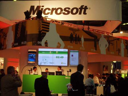 Visitors pass Microsoft booth at the 3GSM World Congress 2007 in Spain. Microsoft China plans to set up an IT training center in Wuxi to boost the city's emerging IT industry. [Sina]