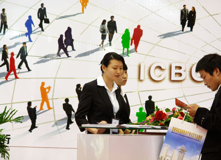 This undated file photo shows a visitor counsulting with the Industrial and Commercial Bank of China staff at an exhibition. The bank posted strong profit growth of 65 percent in 2007.[Asianewsphoto]