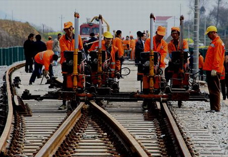 Technical staff closely examine and repair the Tongling-Jiujiang railway's Jiangxi section on March 25, 2008, making final preparations for the railway's official operation. The Tongling-Jiujiang railway construction project is one of the State's key projects.