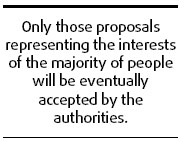 The annual sessions of the NPC and CPPCC offer different groups a stage on which to pursue their interests. But only proposals representing the interests of the majority of people will be eventually accepted by the authorities. The author is a researcher with the Institute of Finance and Banking under the Chinese Academy of Social Sciences