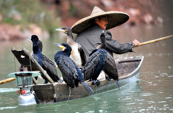 Zhang Ziqiang, 44, comes from one of two remaining fishing families that still use traditional domesticated cormorants to catch fish for a living in Guankou village, Laifeng county, Hubei province.