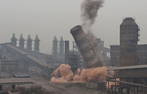 A furnace is blasted off in Tangshan, North China's Hebei province, Nov 24, 2013. Hebei province is taking unprecedented steps to tackle industrial overcapacity as a response to air pollution problems in North China by dismantling 10 furnaces of steel companies, cutting iron production by 4.56 million tons and steel production by 6.8 million tons. [Photo/Xinhua] |