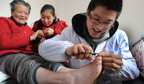 A male nurse gives a pedicure to an elderly woman at a nursing home in Taixing, Jiangsu province, in 2012. He had been working in the nursing home for five years. Many patients' families prefer male caregivers, but turnover is high because of the low pay. LUO ZHONGMING / FOR CHINA DAILY