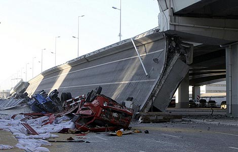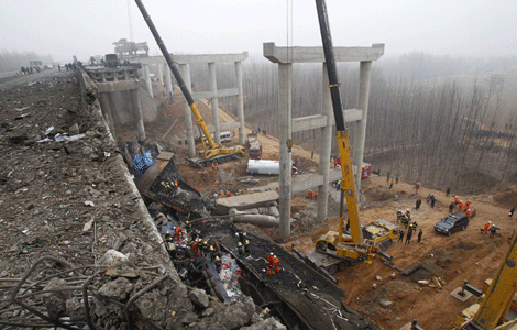 The ramp of a multimillion-dollar bridge in northeast China collapsed early Friday morning, sending four trucks falling 30 meters to the ground, killing three people and injuring five.