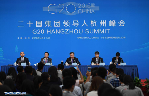 A press conference of the Business 20 (B20) summit is held in Hangzhou, capital of East China's Zhejiang province, September 1, 2016.