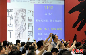A painting by contemporary Chinese artist Qi Baishi was sold by Beijing-based China Guardian on Sunday for 425.5 million yuan ($65 million), a record high for contemporary and modern Chinese paintings and calligraphy.