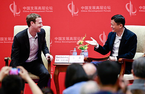 Facebook CEO Mark Zuckerberg and Jack Ma, CEO of Alibaba Group, jointly attend a panel discussion held as part of the China Development Forum 2016.