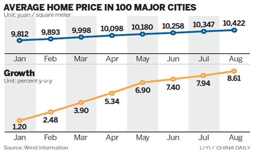 New home prices in 100 major cities averaged 10,442 yuan ($1,706) per square meter in August, rising for 15 consecutive months in month-on-month terms.