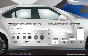 Vehicle imports grew 7.3 percent to 1.17 million last year, with a strong rebound in the fourth quarter helping make up for a decline in the first half, China Automobile Trading Co Ltd said.