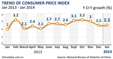 China's consumer price index, a main gauge of inflation, rose 2.5% year-on-year in January, the same as the previous month.