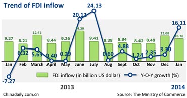 Foreign direct investment into the Chinese mainland rose 16.11% year-on-year in January to reach $10.76 billion, the Ministry of Commerce said Tuesday.
