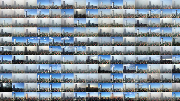 A combination of 225 photos taken at the same angle from a building on the Third Ring Road between 8 and 9 am from March 1, 2012 to March 5, 2013 record the different shades of blue and grey skies that shroud the Chinese capital.