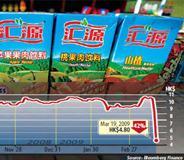 Shares of China Huiyuan Juice Group Ltd plunged in Hong Kong Thursday after the government blocked Coca-Cola Co's $2.4 billion bid for the juice maker.