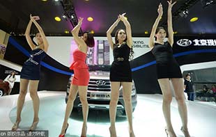 A Korean model poses next to Han Han's CTCC racing car at Kumho Tires pavillion on April 25 during Auto Shanghai 2013. [Photo / icpress.cn]