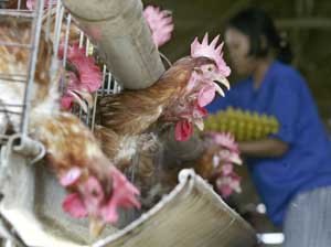 A worker collects eggs at a chicken farm outside Jakarta February 5, 2004.