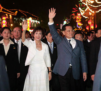 KMT Chairman Lien Chan and wife Lien Fang-Yu wave to citizens during a visit to the Confucius Temple in Nanjing, East China's Jiangsu Province April 27, 2005. [newsphoto]