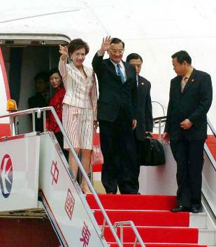 KMT Chairman Lien Chan and wife Lien Fang-yu wave to the well-wishers upon arrival at a Xi'an airport, Northwest China's Shaanxi Province April 30, 2005. [people.com.cn]