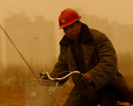 A resident rides a bicycle through a sand storm on a street in Shenyang, in