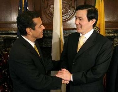 Los Angeles Mayor Antonio Villaraigosa (L) greets Ma Ying-jeou,